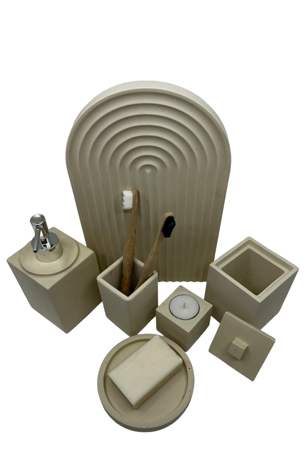 Setin ana parçalarından olan sıvı sabunluk, kullanımı kolay pompasıyla hijyenik bir deneyim sunar. Bej rengin sıcak tonları, banyonuzda sakin ve huzurlu bir atmosfer yaratırken, betonun ham dokusu modern bir kontrast oluşturur. Bazı setlerde bulunan mermer desenli detaylar, ürüne sofistike bir dokunuş ekleyebilir.