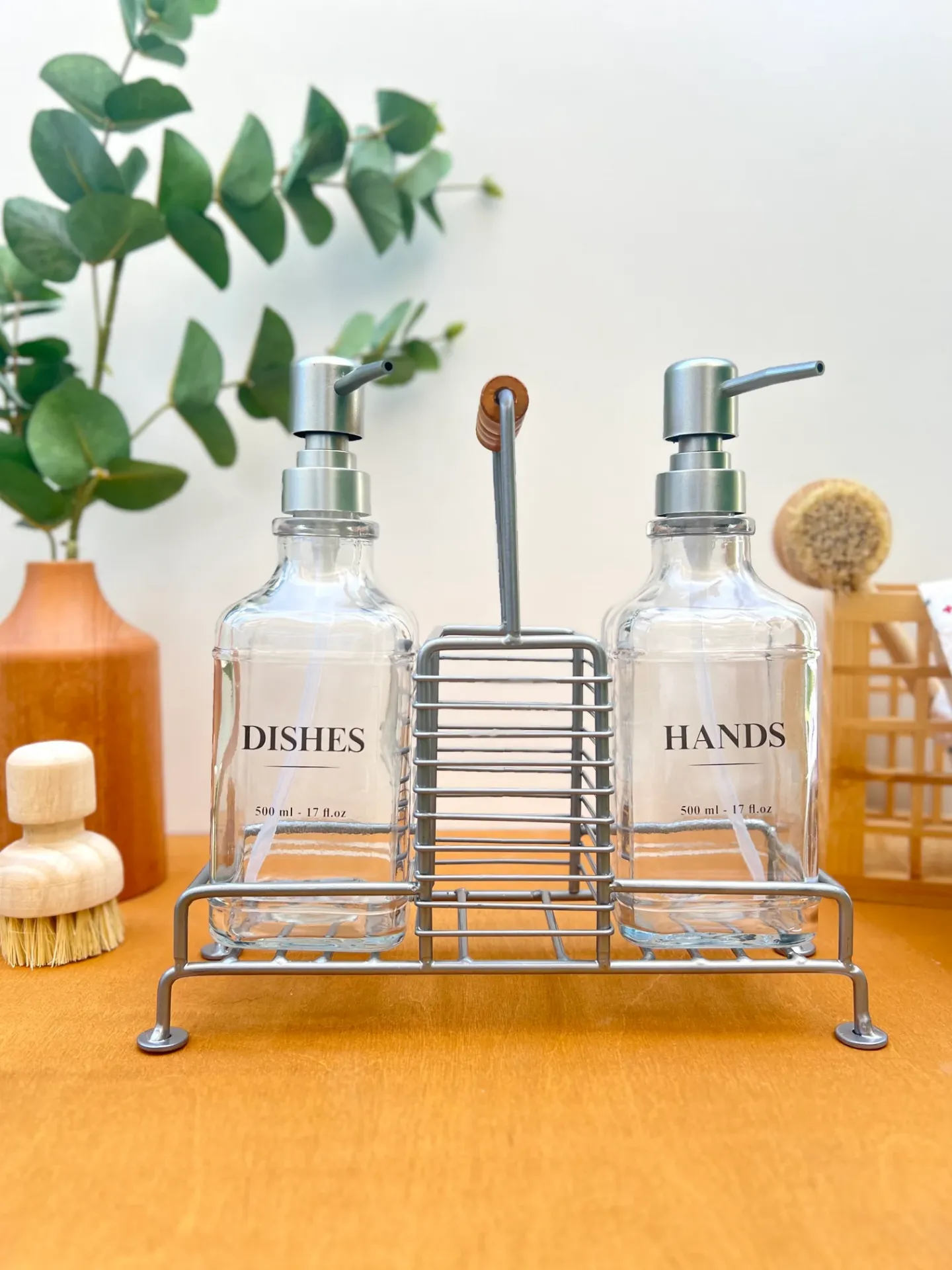 Sabunluklar, sağlam ve açık tasarımlı gümüş tonlarında metal bir stand içinde şık bir şekilde yerleştirilmiştir. Bu stand sadece sabunlukları düzenli tutmakla kalmaz, aynı zamanda tezgahınıza modern, endüstriyel şık bir dokunuş katar. Stand, damlamaları ve dağınıklığı önleyerek yüzeylerinizi temiz ve düzenli tutmaya yardımcı olur. Şeffaf camın minimalist tasarımı, sabun seviyelerini kolayca takip etmenizi sağlar ve çağdaşdan rustiğe kadar geniş bir iç mekan dekorasyon tarzına uyum sağlar. Standın üst kısmında bulunan kahverengi (ahşap görünümlü) kulp detayı sete sıcak ve doğal bir dokunuş ekler.
