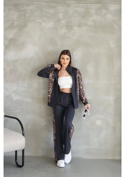 Osy Modal Yumuşak Dokulu Kumaş Kapüşonlu Leopar Desenli Fermuarlı Takım - Antrasit