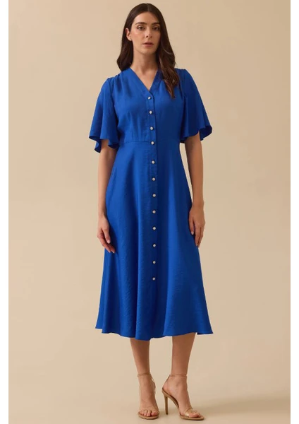 Kadın Düğme Detaylı Volan Kol Midi Elbise - Saks Mavi